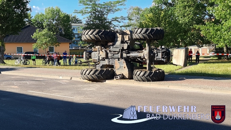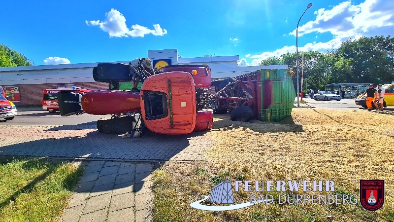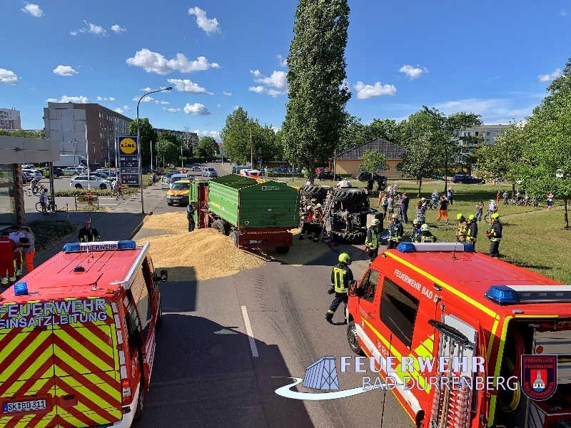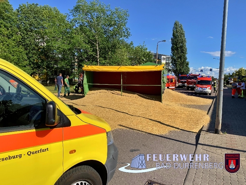 Zu einem nicht alltäglichen Einsatz wurden die Feuerwehren Bad Dürrenberg und Tollwitz in die Dürrenberger Breite Straße alarmiert. Hier war ein Traktor samt Hängerzug umgestürzt und die Ladung von fast. 20 Tonnen Gerste lagen auf der Straße. Nach erster Erkundung der eingetroffenen Einsatzkräfte konnte von Glück gesprochen werden, dass keine Person verletzt wurde.