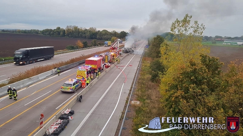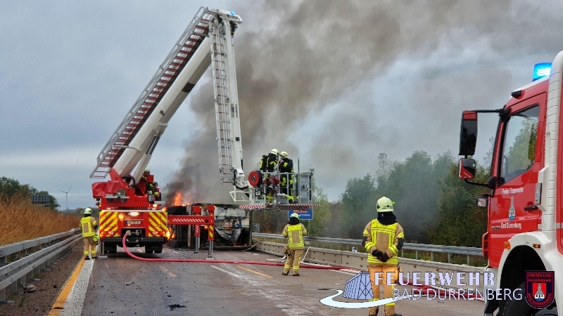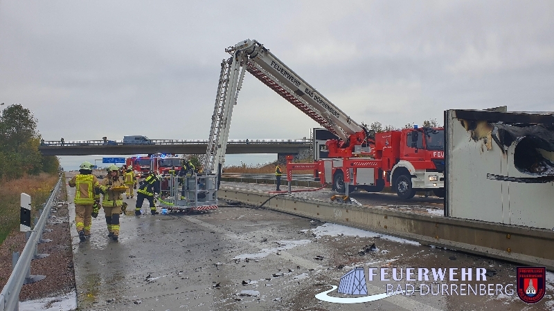 17:48:59Als heute morgen die Sirenen heulten, konnte man am Horizont schon vermuten wohin es ging. Dichte schwarze Rauchwolken zogen aus Richtung Autobahn ins Umland. Ein LKW war nach Kollision mit der Leitplanke im Baustellenbereich der A9 in Fahrtrichtung München auf die Seite gekippt und in Brand geraten. Gemeinsam mit der Feuerwehr Tollwitz, und der Feuerwehr Kötzschau nahmen wir einen Löschangriff unter anderem auch mit Schaum von drei Seiten vor. Mit unserem Tanklöschfahrzeug und dem Großtanker der Feuerwehr Großkorbetha wurde die Löschwasserversorgung auf die Autobahn sichergestellt, sodass kontinuierlich gelöscht werden konnte. Nach 2 Stunden konnte 'Feuer aus' gemeldet werden und es ging zurück ins Gerätehaus die Einsatzbereitschaft wiederherstellen. Der LKW Fahrer kam zur Kontrolle in ein Krankenhaus.